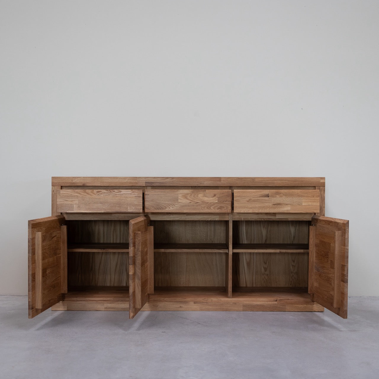 Die Anrichte Utah mit seinen drei Türen und drei Schubladen aus massiver Eiche wurde entworfen, um Ihnen reichlich Stauraum mit nordischem oder skandinavischem Flair zu bieten. Dieses Stück schafft eine warme und helle Atmosphäre in Ihrem Wohnzimmer, Esszimmer, Büro oder jedem anderen Raum in Ihrem Zuhause.