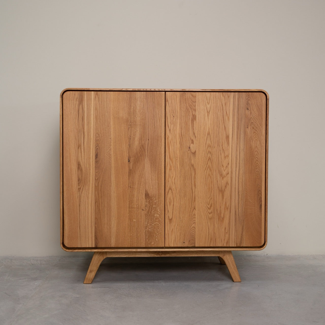 Das Sideboard "Genf 1 von NordicStory ist aus nachhaltigem, massivem Eichenholz gefertigt und verbindet nordischen Stil mit Langlebigkeit. Es misst 90x45x86 cm und hat 2 Türen, die eine große Kapazität für die Aufbewahrung von Utensilien, Geschirr und anderen Gegenständen bieten. Das robuste Design und die natürlichen Oberflächen machen ihn zu einem eleganten und vielseitigen Möbelstück, das sich ideal für das Wohnzimmer, das Esszimmer oder jeden anderen Raum eignet, in dem Ordnung und ein raffinierter dekorativer Touch gefragt sind.