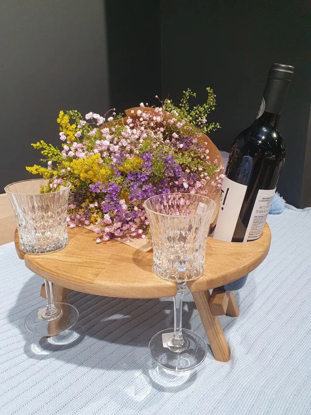 Der Weintisch Merci ist ein kleiner Klapptisch aus massivem Eichenholz, ideal für ein Picknick, am Strand oder im Bett. Er hat eine Aussparung, damit die Weinflasche nicht herausfällt, und vier Halterungen für Gläser.